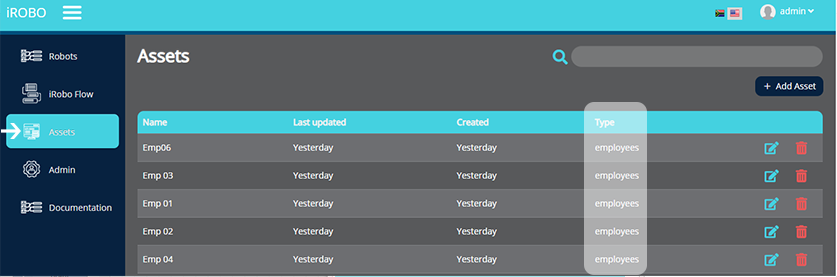 - Each time the user adds asset of the same type in iRoboControlPanel as shown in the image below, api in node listens in iRoboFlow.