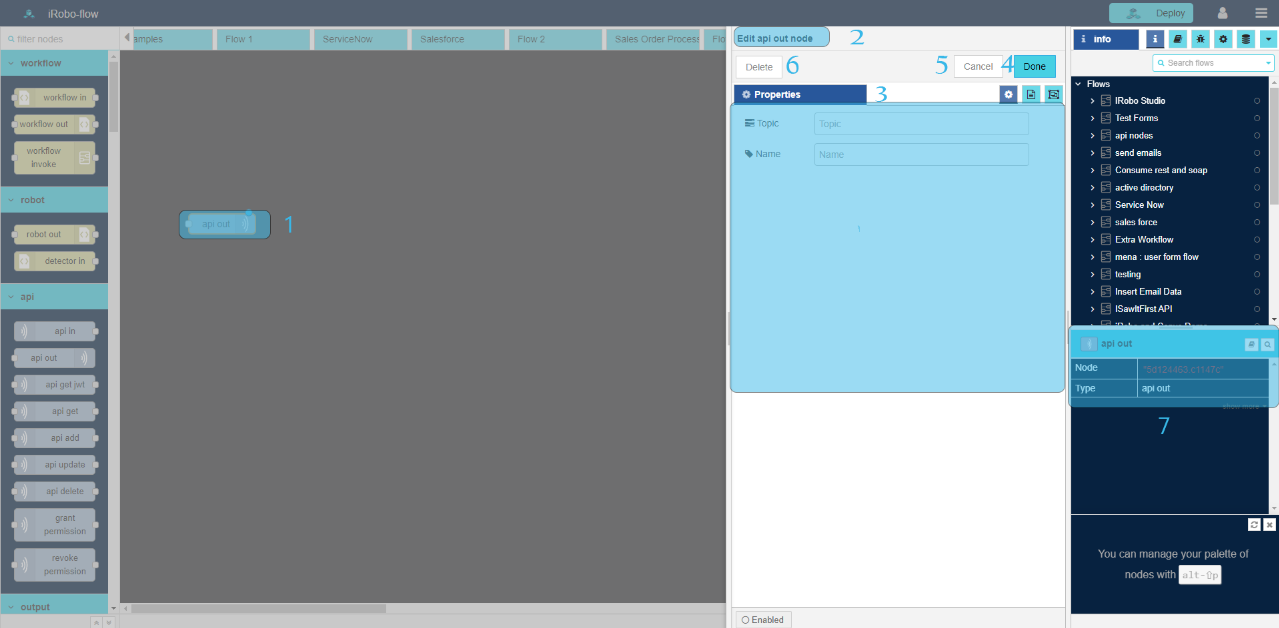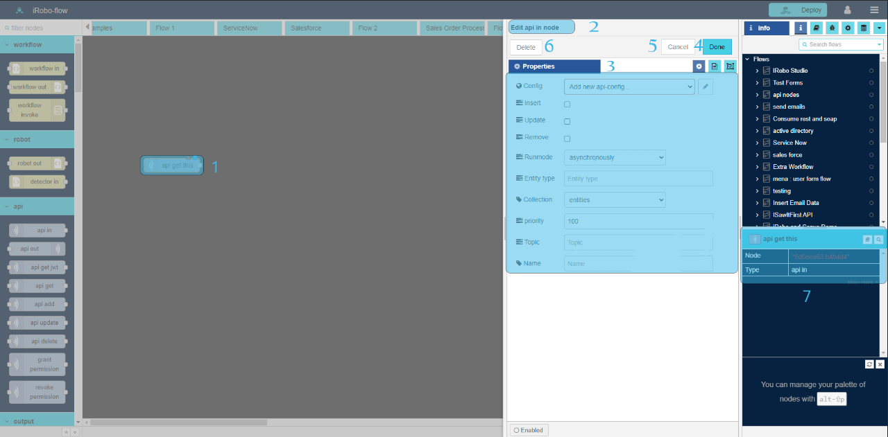 - Drag api out node to the Flow; complete the calling of api in node.