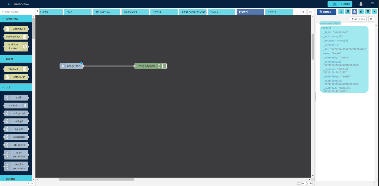 button: to deploy the created Flow. - msg.payload of Debug node is displayed in Debug Panel each time the user adds asset/ entity in iRoboControlPanel, click on message in Debug Panel to expand to view message details as shown in the image below. Data is displayed in payload Object with array of data; listing asset properties; such as name, id, type, etc...