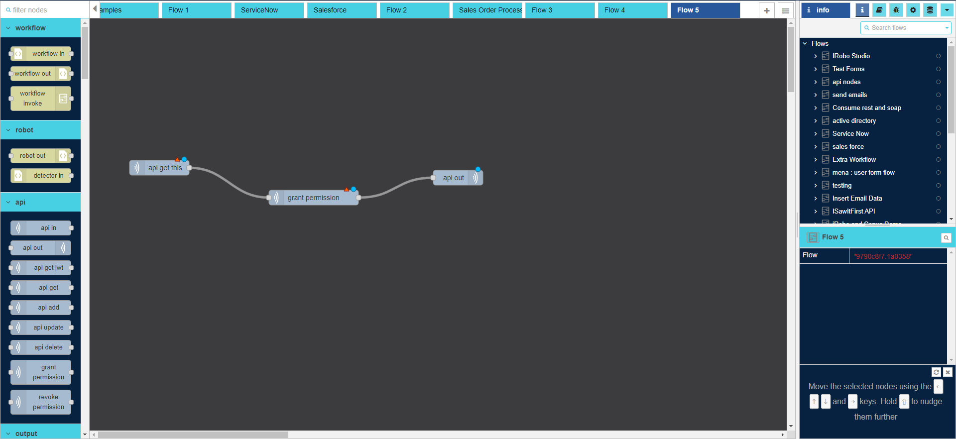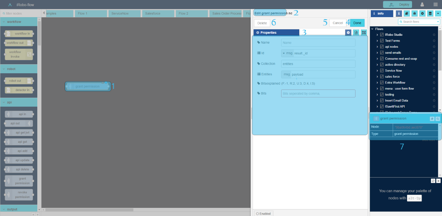 - Connect grant permission node to api out node with node connectors.