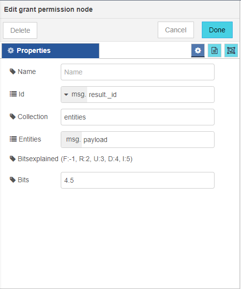 - Edit grant permission node Panel is opened to the right as shown in the image below.