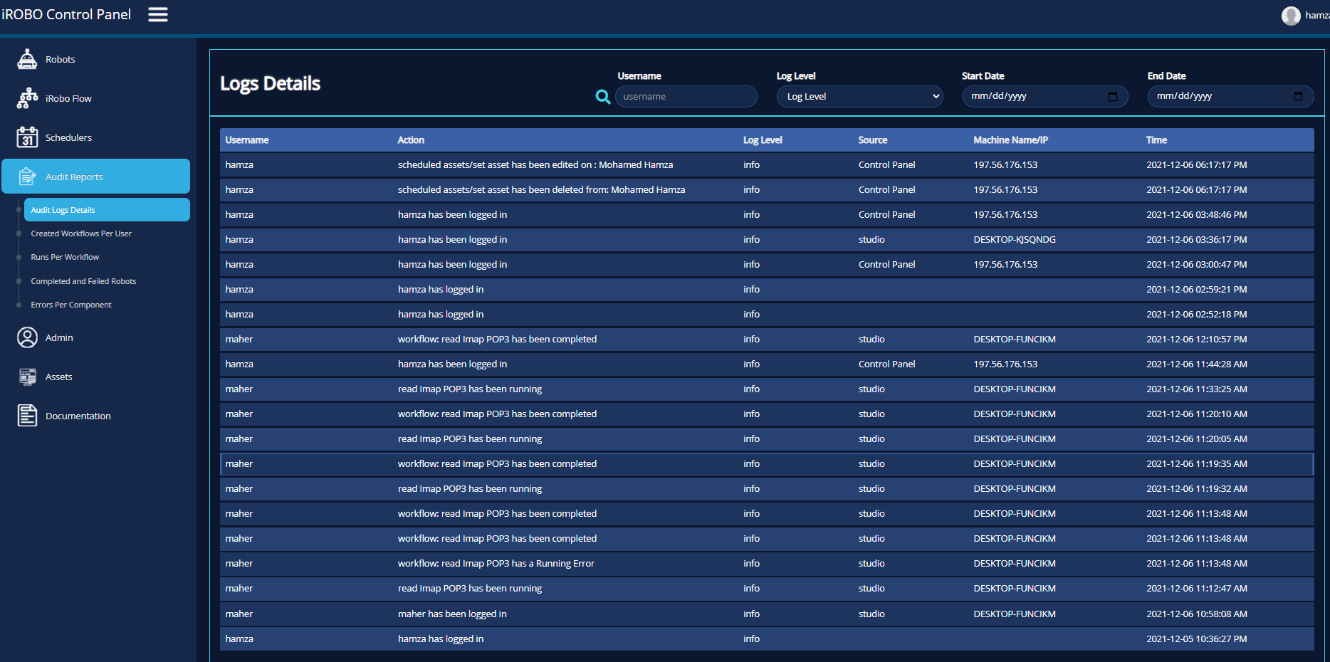 It displays User Name (user who commit the action), Action (Type of Action done by user), Log Level (Info 'information'/ error), Source (iRobo Component: Studio, Control Panel), Machine Name/ IP (Machine Name/ IP Address) and Time (Date, Time).