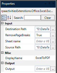 - RemovePageBreaks - If True, Excel file is exported in a single page & page breaks between pages in the PDF file are removed. While if it's False, it is restricted by page size. Its input is True/False arguments. (Mandatory)