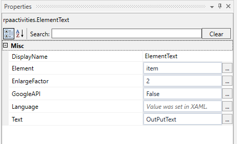 - Create Output Text Variable for the cropped out image that contains Text of the Element field in Properties Panel as shown in the image below.