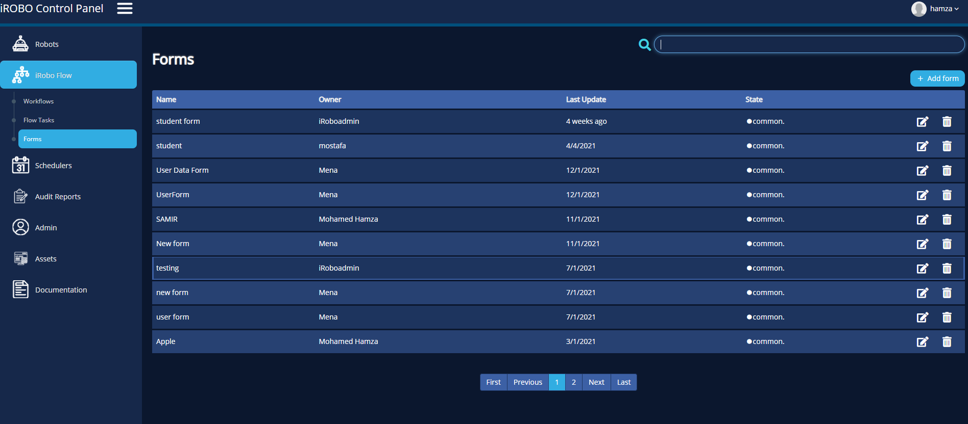 Forms page allows user to create, edit or delete Forms used in Workflows in iRoboFlow.