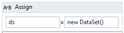 - Assign DataSet Variable to the first Assign Activity as: ds = new DataSet(), as shown in the image below.