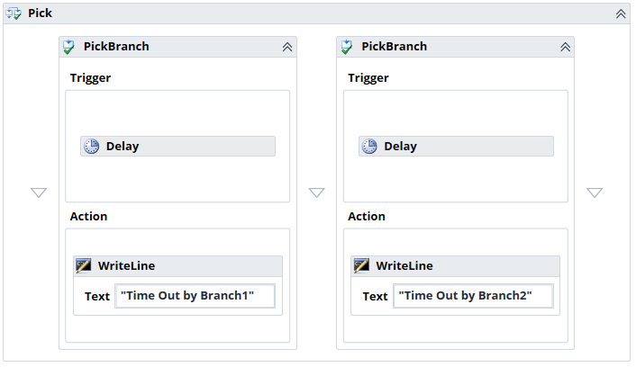 The following example shows Pick activity with two branches. the two branches gets two Delay activities with different duration time. If the the first Delay activity finishes before the second activity finishes, then the first branch action will be executed.