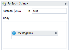 - Drag MessageBox Activity to Body of ForEach Activity, as shown in the image below.