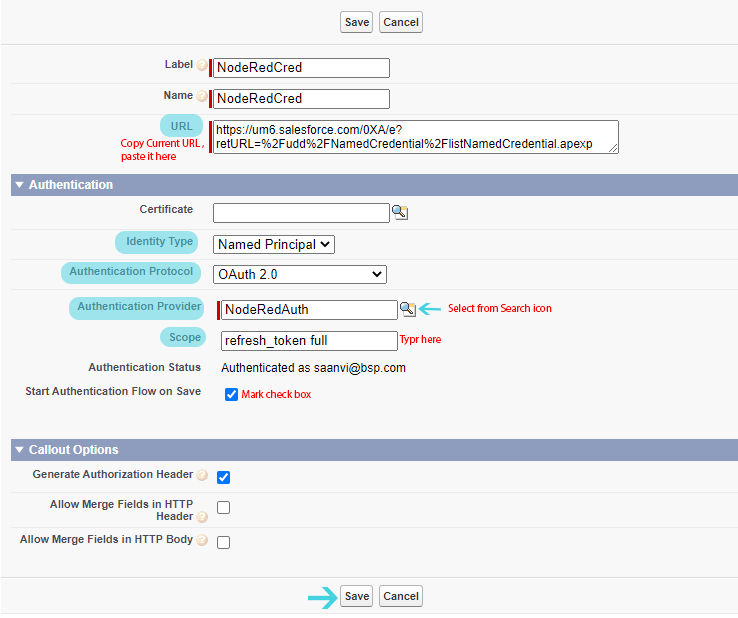 - After that, go to named credentials the one you created and click save button. So, it will navigate to login screen. Just provide the username and password details and accept allow the following pop ups conditions.