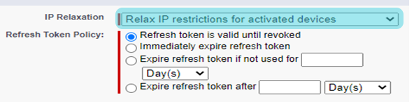 - Also, in the created connected App, edit the policies and choose the below settings.