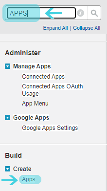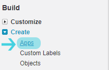 - Type APPS in the Quick Search area. Then, select Apps under Build, Create tab as shown in image below.