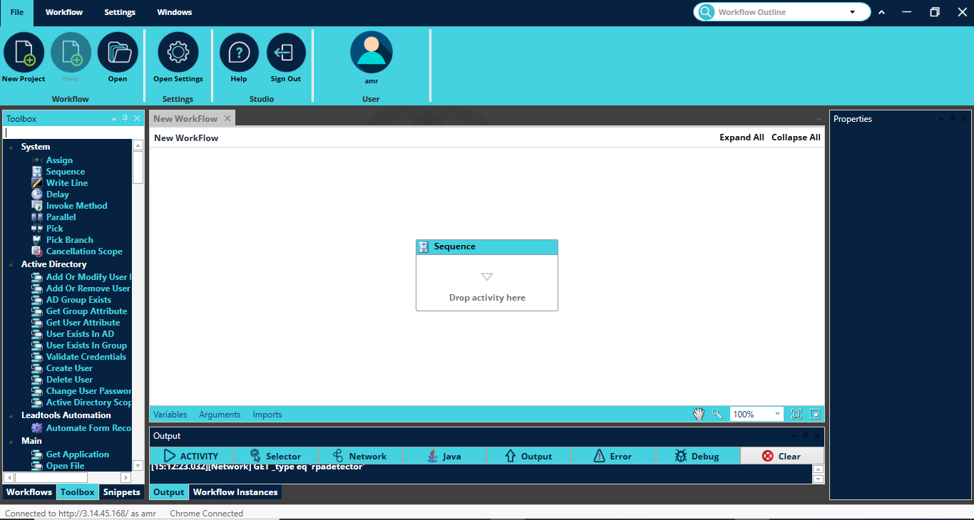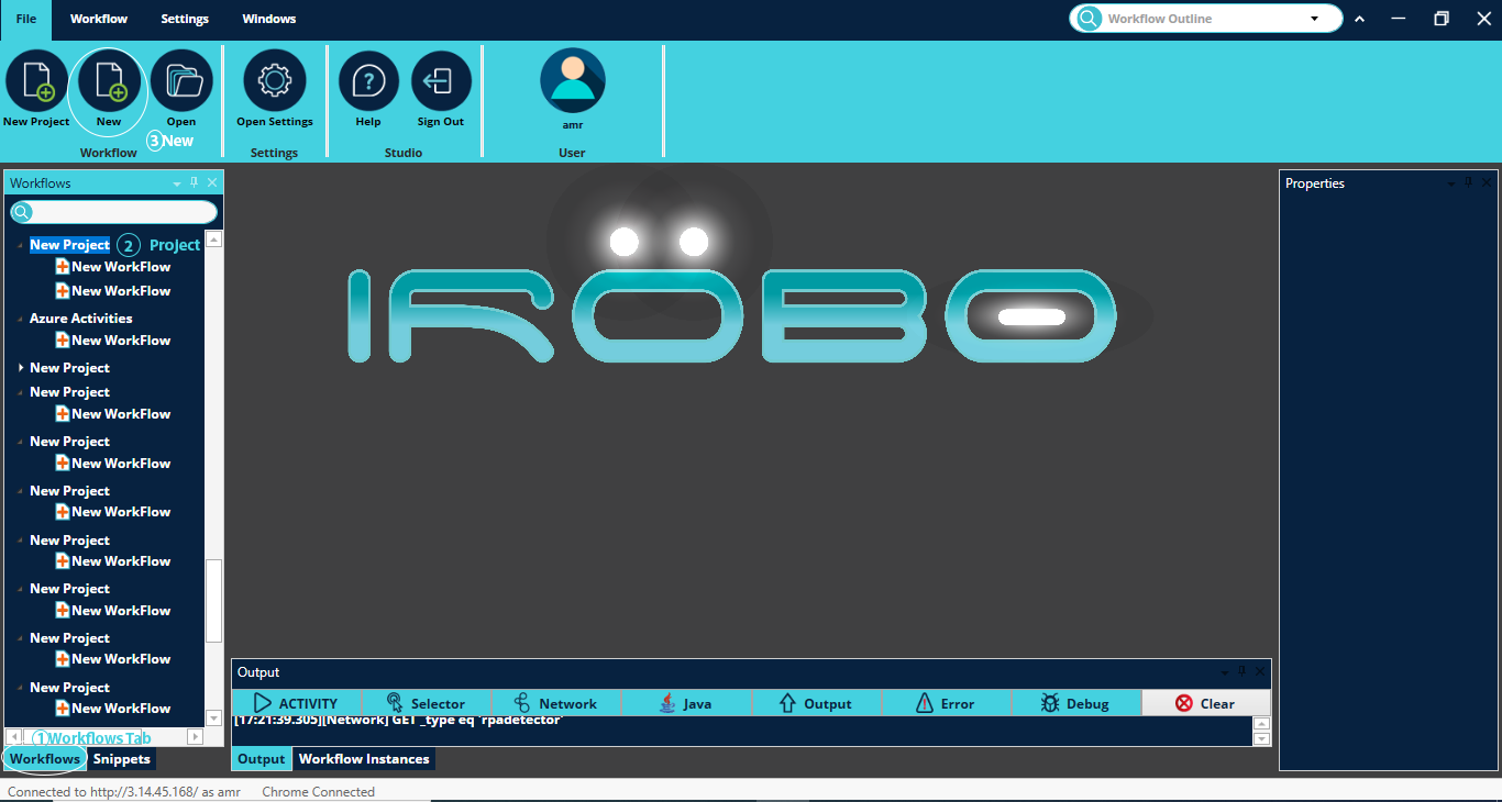 Enter Project Name, then click Ok button, iRobo Studio main screen is opened with a New Workflow as show in the image below.