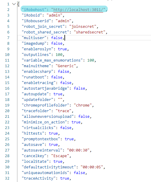 Click on Open Settings button: open iRobo Studio settings file in .jason format, as shown in the image below.