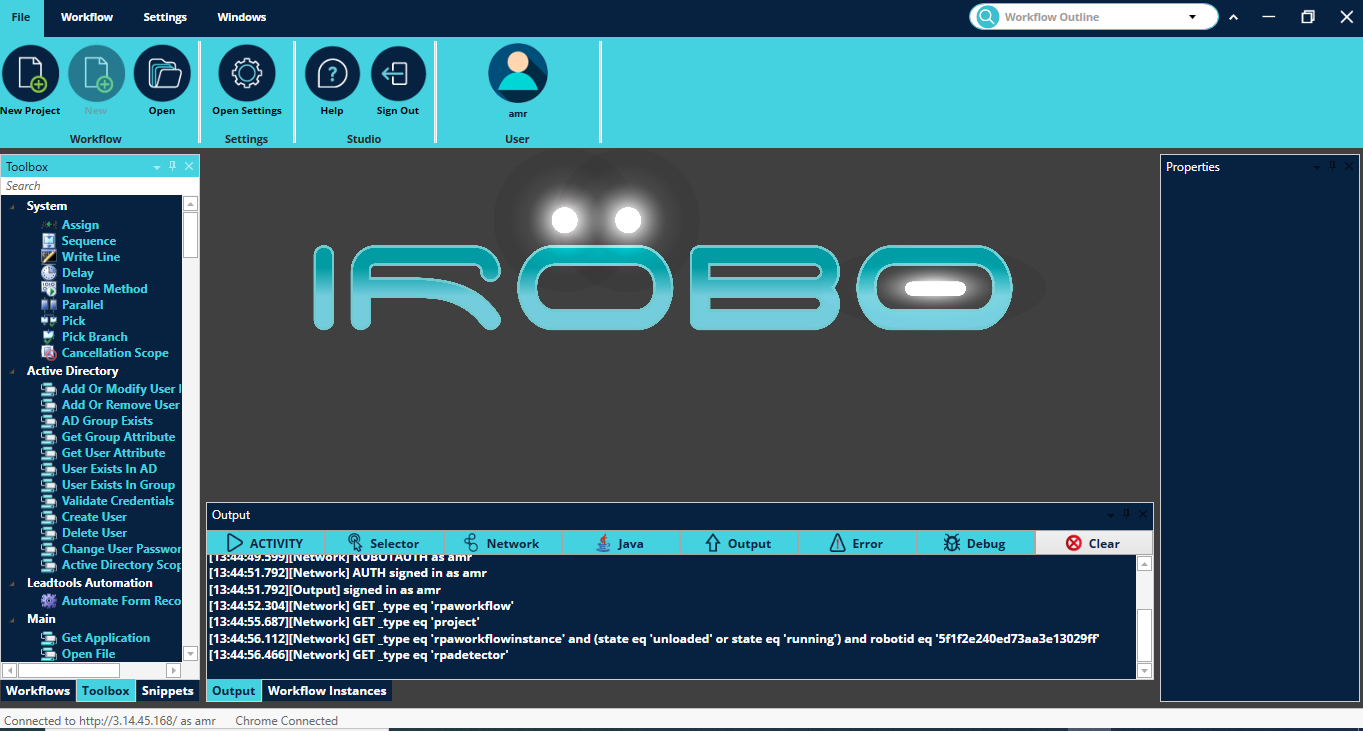 iRobo Studio main screen opens allows the user to start building the business automated processes.