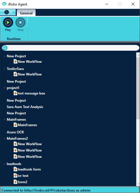 To login to iRobo Agent, the user must use the iRobo Studio user account that allows the user only to run Workflows created by the logged user account. Workflows are created under Projects.